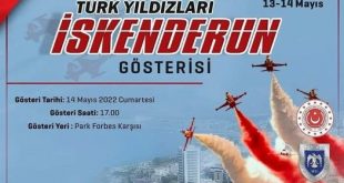 Türk Yıldızları 14 mayıs’ta İskenderun’ a gelerek gösteri uçuşu yapacağı öğrenildi.Türk Silahlı Kuvvetlerinin gözbebeği Türk Yıldızları İskenderun’da yine gösteri uçuşu yapacak. Geçtiğimiz yıl İskenderun’a gelerek hava muhalefetinden dolayı gösterileri yarıda bırakan Türk Yıldızları 14 Mayıs Cumartesi günü Park Forbes AVM karşısında yine İskenderunlulara gösteri uçuşu yapacağı bildirildi.