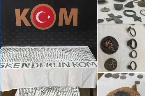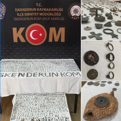 İskenderun Dumlupınar Mahallesi’nde durdurulan bir kişinin çantasında 2 bin 620 adet Sikke, 33 yüzük, 73 metal Obje, 4 adet toprak kandil, 1 Adet unguentarium (Parfüm Şişesi) ele geçirildi.